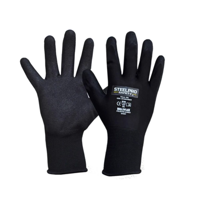 El guante Multiflex es un guante de trabajo versátil y resistente diseñado para brindar protección y comodidad en diversas aplicaciones laborales. Está fabricado con una combinación de materiales, incluyendo nitrilo, nitrilo sandy y poliéster. El recubrimiento de nitrilo en la palma y los dedos del guante proporciona un excelente agarre, incluso en condiciones húmedas o aceitosas. Esto permite un manejo seguro y preciso de objetos, evitando resbalones y mejorando la productividad en el trabajo